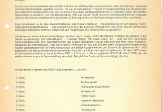 Diese Aufgabe ging dann 1987 auf das Haus der Heimat des Landes Baden-Württemberg über. Zur reinen Fragebogenform kam bald ein bildnerischer Wettbewerbsteil, der Kreativität forderte. Anlässlich des 40. Jahrestags seit dem Ende des Zweiten Weltkriegs wurden auch zeitgeschichtliche Fragestellungen in den Wettbewerb aufgenommen, die mit unterschiedlichen Textarten zu lösen sind.