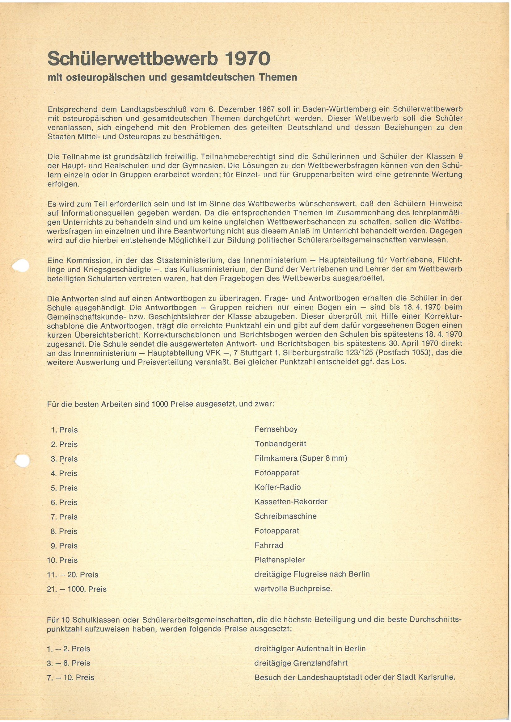 Im Dezember 1967 beschloss der Landtag, künftig einen Schülerwettbewerb mit gesamtdeutschen und osteuropäischen Themen durchzuführen. Die erste Preisverleihung fand im Juni 1970 in der Villa Reitzenstein statt. Damals organisierte noch der Landesverband des Bundes der Vertriebenen den Wettbewerb.