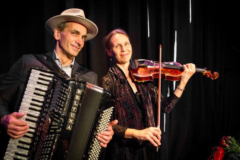 Das Duo Bluesette mit Katharina Wibmer, Geige, und Frank Eisele, Akkordeon, hat sich ein Repertoire aus osteuropäischen Tänzen, französischen Musettewalzern, von Tango bis Csárdás aufgebaut.