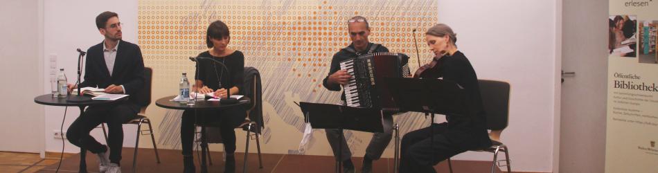 Das Duo Bluesette mit Katharina Wibmer, Geige und Frank Eisele, Akkordeon spielte als Auftakt eine Mazurka – aber der Dreier-Takt war nicht unbeschwert beschwingt, sondern sehnsuchtsvoll. Trauer, aber kein Pathos, Schmerz, aber keine Sentimentalität waren die Klangfarben des Abends, dem Thema „Wolfskinder“ angemessen. In den knappen, intensiven Szenen, die Aurelia Orel und Dominik Eisele aus dem Roman von Alvydas Šlepikas lasen, wurde kein Handlungsstrang konsequent nachverfolgt . Sie erzählten von Hunger, Kälte, Gewalt, Heimatlosigkeit, Hass, auch von Erbarmen und Hoffnung. Sie beschrieben das grausame Umfeld, in dem die Kinder im Ostpreußen der unmittelbaren Nachkriegszeit versuchen mussten, zu überleben. Nach Vorträgen und Interviews war dies der künstlerische Zugang zu einem Thema, das als weitere, schwer erträgliche Facette des Zweiten Weltkriegs und seiner Folgen erinnert werden muss.